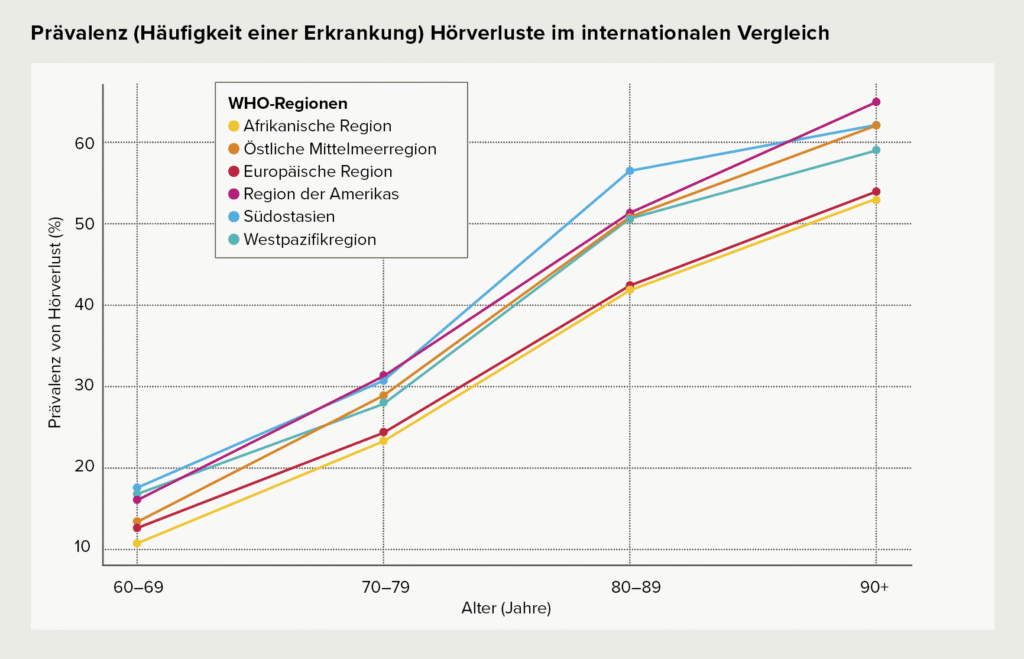 Weltweit sind über 65 Prozent der Menschen über 60 Jahre von einem Hörverlust betroffen. Bei 25 Prozent liegt ein Hörverlust mittleren bis hohen Grades vor. Im Vergleich sind 50 Prozent der Menschen im Alter zwischen 12 bis 35 Jahren aufgrund unsicherer Lautstärken in Freizeitumgebungen einem erhöhten Risiko für einen Hörverlust ausgesetzt.