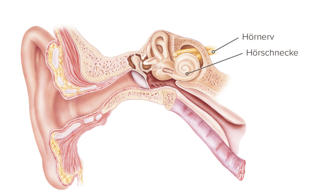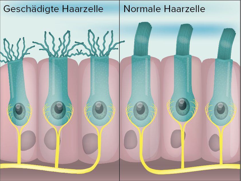 Diese Veränderungen führen zu Degenerationen am Innenohr. «Sensori» bezieht sich auf Sinneszellen, oder auch Haarzellen genannt, die im Innenohr lokalisiert sind. Sie wandeln Schall in elektrische Signale um. «Neural» bezieht sich auf Hörnerv, der die Signale an das Gehirn weiterleitet. Die Degeneration kann in den Haarzellen im inneren Ohr, die in der Hörschnecke (Cochlea) sitzen, oder im Hörnerv lokalisiert sind.