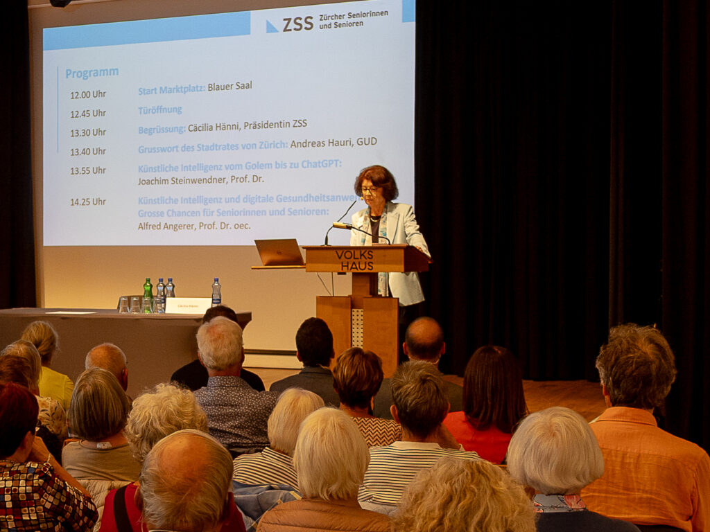 Weit mehr als 300 Seniorinnen und Senioren haben an der 20. Alterskonferenz vom 23. September im Zürcher Volkshaus teilgenommen. ZSS-Präsidentin Cäcilia Hänni war überwältigt vom grossen Interesse. «Mit dem Thema Künstliche Intelligenz haben wir wohl den Nerv der Zeit getroffen», sagte sie in ihrer Begrüssungsrede. Es seien sogar mehr Anmeldungen eingetroffen als Plätze zur Verfügung standen.