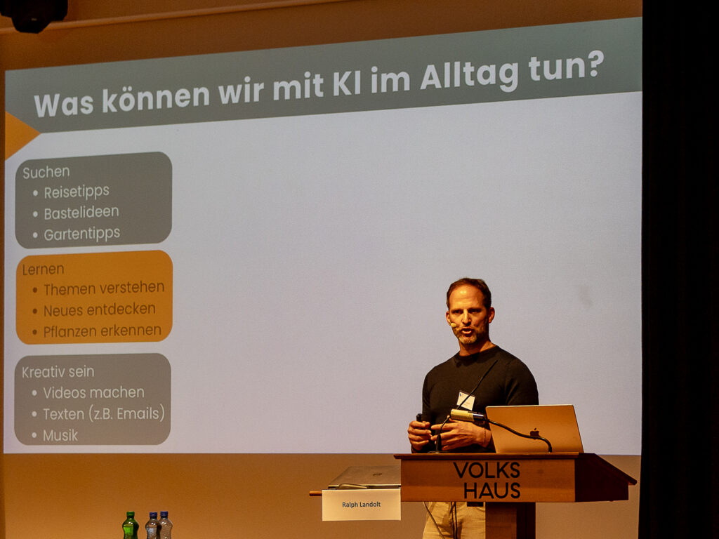 Unterstützung bei der selbstbewussten Nutzung von digitaler Technologie ist das Spezialgebiet von Ralph Landolt, Gründer von Techtipp. In seinem Referat zeigte er die Bearbeitung eines Handybildes indem er eine Person darauf verschwinden liess. «Das ist mit Hilfe von KI möglich – was bedeutet, eigene fake news zu generieren», erklärte er.